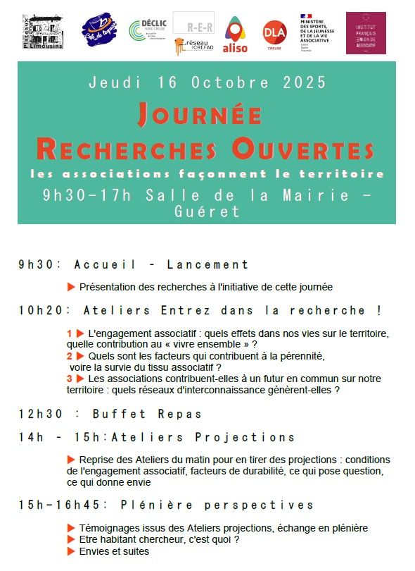 Avec le DLA Creuse/ Reseau Aliso et la Délégation départementale à la Vie Associative, elles ont animé cette journée de partage d’expérience et de recherche, le 16 octobre 2025 à la Salle de la Mairie de Guéret, que nous remercions pour son accueil.