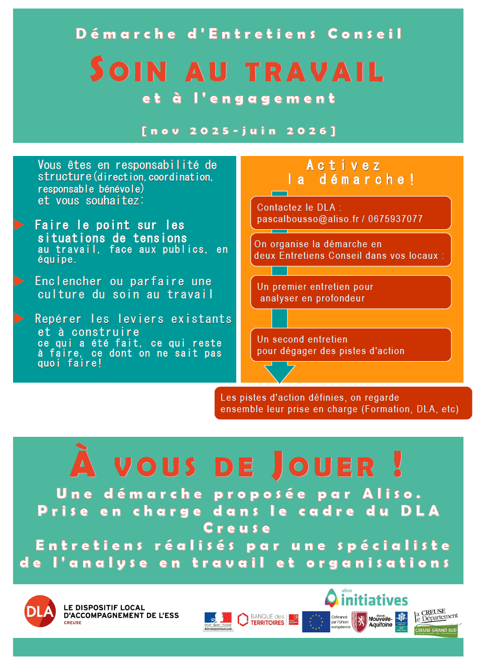 > Prenez contact avec le Chargé de mission DLA Creuse (pascalbousso[at]aliso.fr) qui mobilisera ensuite l’équipe dédiée à la conduite de ces entretiens, constituée d’une psychologue du travail et d’une psychosociologue ayant une sensibilité aux questions d’organisation et de gestion d’équipe.